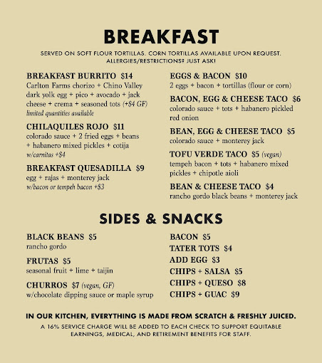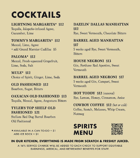Indulge in delicious Tex-Mex favorites like wagyu beef tacos, queso, tortas, and weekend breakfast burritos. Enjoy expertly crafted cocktails made with fresh, organic ingredients and a wide selection of tequilas, mezcals, and whiskies.